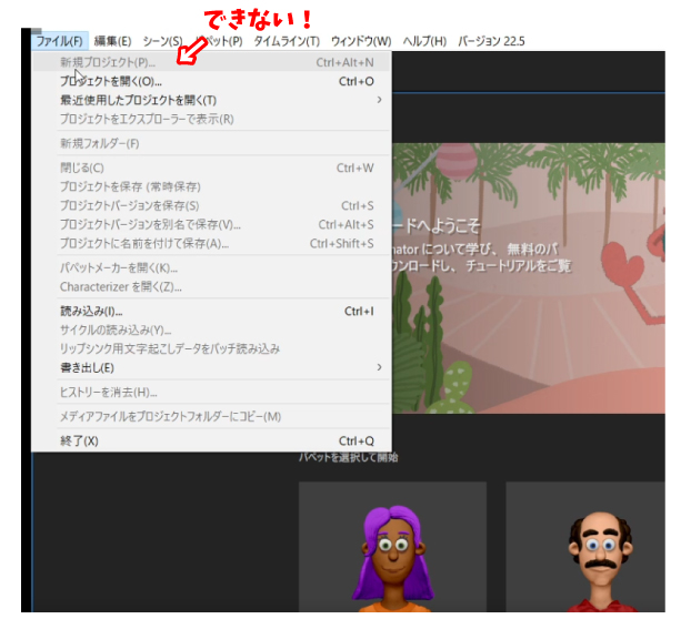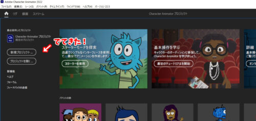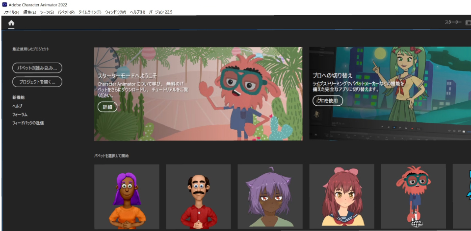 Adobe Character Animatorインストール後、立ち上げるとこんな画面になります