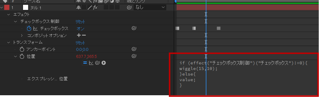 ③ヌル→エフェクトチェックボックス制御→オン・オフのキーフレームを打つ