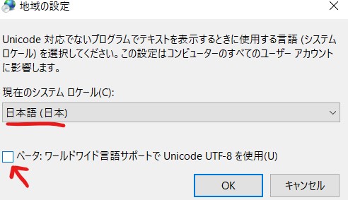ベータ:ワールドワイド言語サポートでUnicode UTF-8を使用にチェックをいれます。