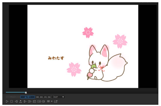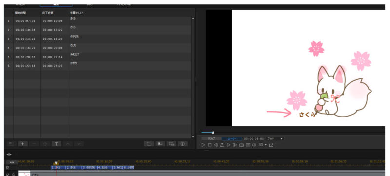 ①プレビューの動画を停止している状態でタイムラインの字幕をクリック選択します。(1のさくらが選択されている状態)