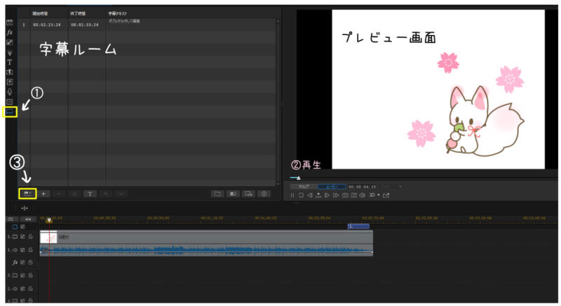③字幕を入れたい場面で字幕ルーム下の