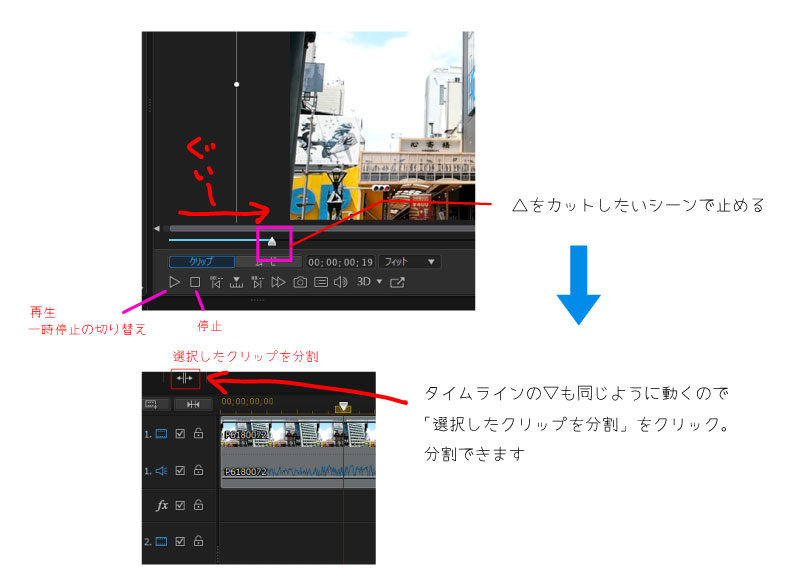 動画をカットするにはまずは不要な場面と必要な場面を分割する必要があります。