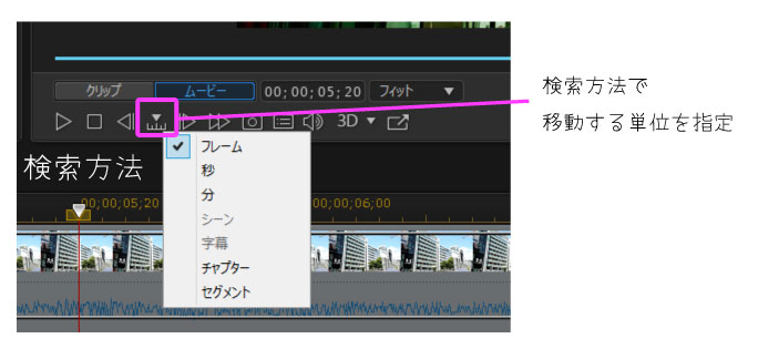 検索方法はフレームが前後に移動する単位、例えば、秒なら1秒ごとに移動できます。