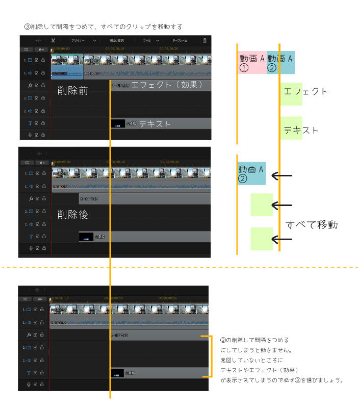 ③の「削除して間隔をつめて、すべてのクリップを移動する」は他のタイムラインのすべてクリップも移動します。