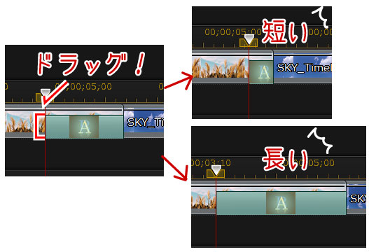 フェードの長さを変えるにはタイムラインのフェードをドラッグして短くしたり長くすることができます。