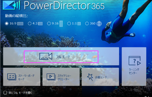 PowerDirectorを起動すると最初にこんな画面がでるのでフルモードをクリック。