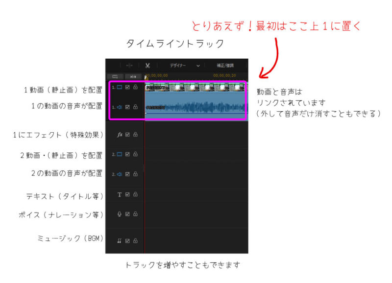 とりあえず、最初の動画は一番上のトラック1においてください。