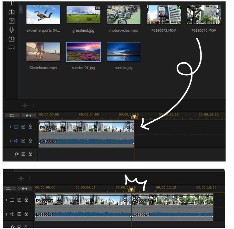 ここでは①と②動画をPowerDirectorに取り込み、動画と動画をつないでいく手順を解説していきます。
