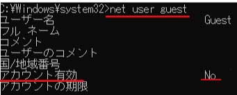アカウント有効がyesなら他のゲストアカウントが有効になっているので無効にする設定を行います。